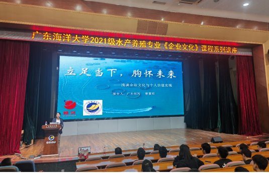 3月5日, 根据产业班人才培养方案,广东恒兴集团人力资源总监王友国、人事部经理曹慧明在广学楼多功能厅为共建产业学院的首届产业班开讲《企业文化》课程。水产学院党委书记王海燕、养殖系副主任黄建盛、产业班班主任汤保贵,以及2021年级水产养殖专业同学参加了会议。