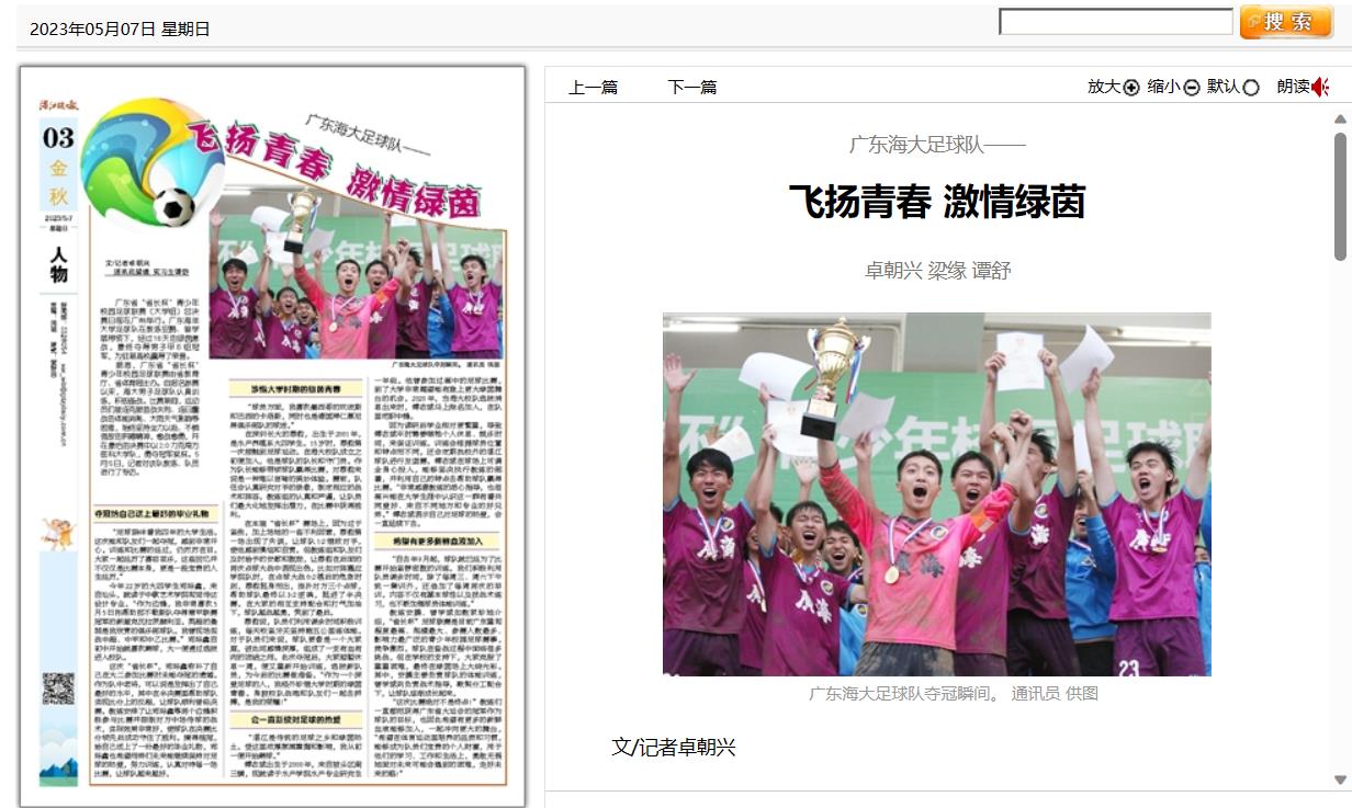 5月7日,湛江晚报03版专版刊发新闻《广东海大足球队——飞扬青春 激情绿茵》,对开云官网男子足球队认真训练,积极备战,在比赛期间克服首战失利、连日鏖战的体能消耗、大雨天气影响等困难,始终坚持全力以赴、不惧强敌的拼搏精神,勇夺广东省“省长杯”青少年校园足球联赛(大学组)男子甲B组冠军的先进事迹进行了报道。
