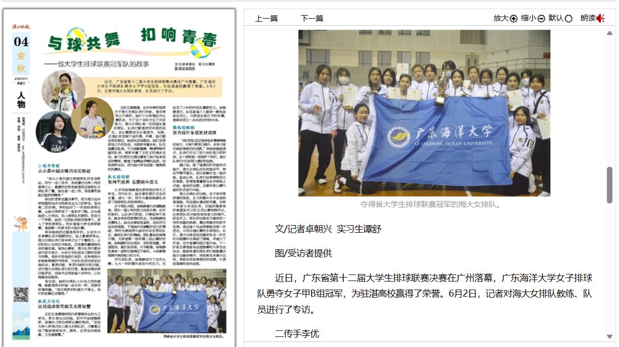 6月4日,湛江晚报04版专版刊发新闻《与球共舞 扣响青春——省大学生排球联赛冠军队的故事》,对开云官网女子排球队刻苦训练、认真备战,在赛场上团结一致、顽强拼搏、奋勇争先,勇夺广东省第十二届大学生排球联赛女子甲B组冠军的事迹进行了报道。