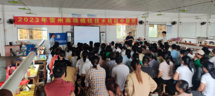 为加快落实广东省百校联百县助力“百县千镇万村高质量发展工程”行动(以下简称“双百行动”),根据学校“双百行动”工作部署会的要求,9月27日,开云kaiyun登录入口珍珠研究团队王庆恒教授和杨创业博士赴雷州市覃斗镇流沙村联合雷州市覃斗镇乡村振兴人才驿站在广东尊鼎珍珠有限公司开展了南珠植核技术培训。培训班由广东尊鼎珍珠有限公司董事长何德边主持,近100名植核技术员参加了培训。
