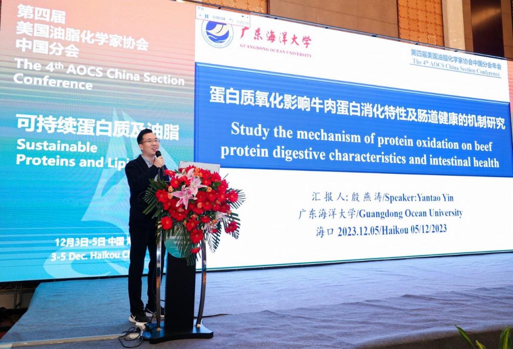 12月3日-5日,食品科技学院夏秋瑜副研究员、刘庆冠博士及殷燕涛博士参加了在海口举办的第四届美国油脂化学家协会中国分会年会。夏秋瑜副研究员作了题为《鱼油的酶法富集改性及其高效稳定与递送》的学术报告,殷燕涛博士作了题为《蛋白质氧化影响牛肉蛋白消化特性及肠道健康的机制研究》的学术报告。
