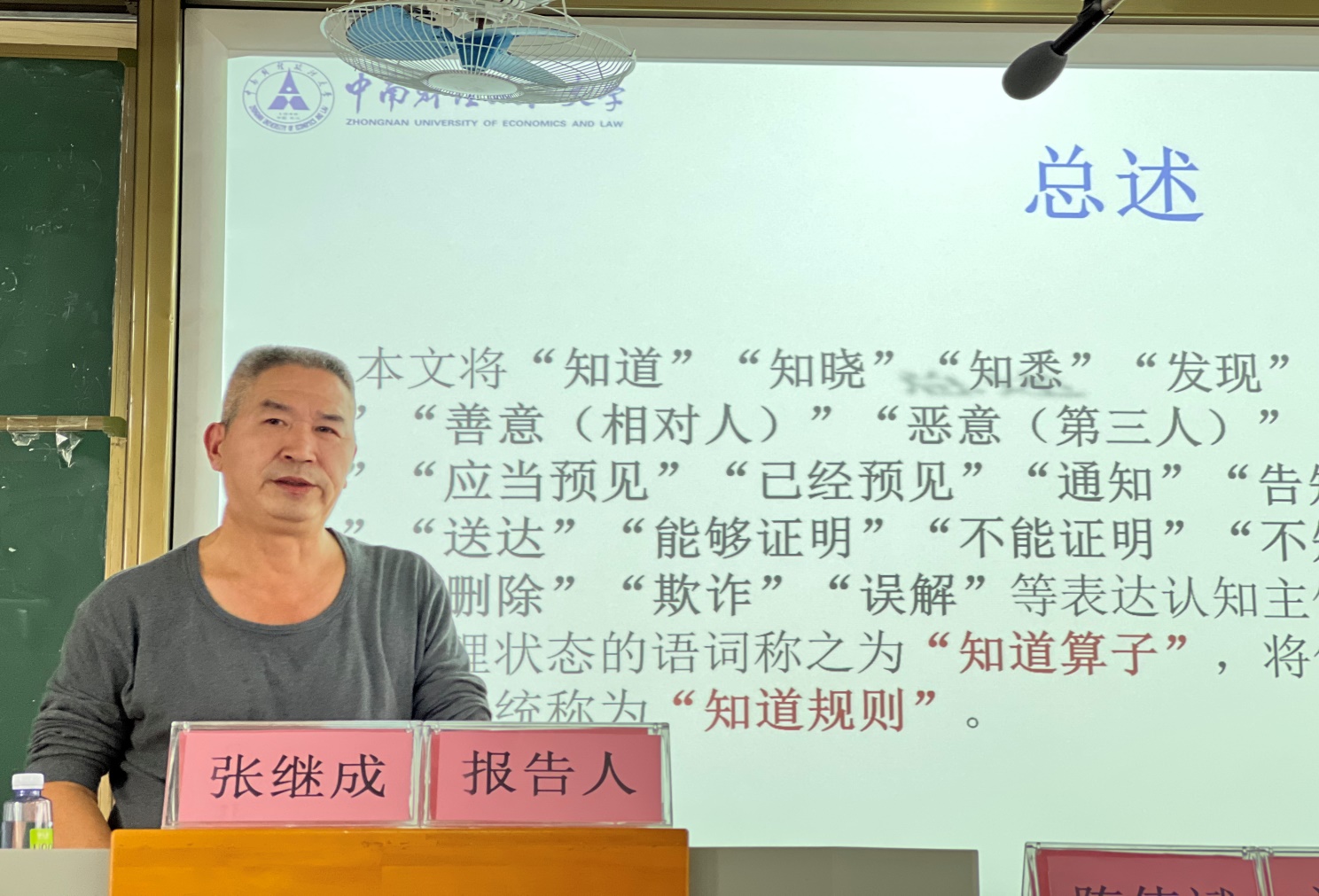 11月15日,中南财经政法大学博士生导师张继成教授受邀做客开云kaiyun登录入口法政学院,以《法律上的“知道”“应当知道”“明知”究竟是什么意思”》为题为学院师生作专题讲座。本次讲座由法政学院主办,学院党委书记陈伟斌主持,法政学院部分教师及全体研究生聆听了本次讲座。