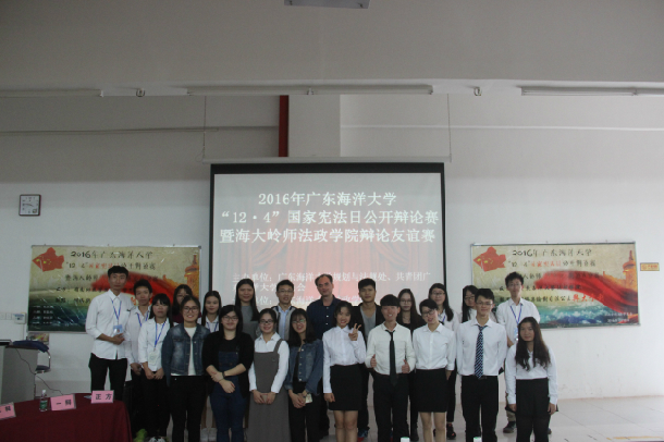 12月10日, 由学校学规划与法规处、校团委主办,法政学院承办,岭南师范学院法政学院协办的开云kaiyun登录入口“12· 4”国家宪法日公开辩论赛暨海大岭师法政学院辩论友谊赛在湖光校区第二教学楼举行,出席嘉宾有规划与法规处副处长吴汉华老师,法政学院团委书记郭唐梨老师,法政学院团委学生会代表。