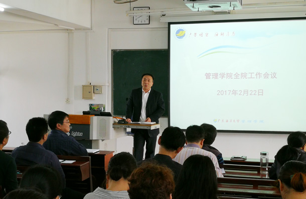 2月22日下午,管理学院在主楼709教室召开新学期工作会议,对2016年度工作进行总结,对2017年新学期工作进行部署。学院党政领导干部、全体教师约70人参加了会议。会议由学院党委书记陈青松主持。