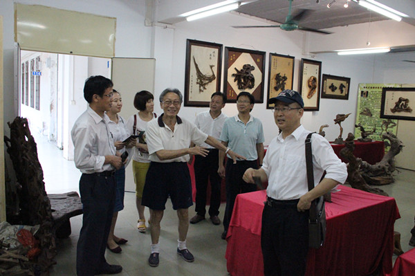 会后,一行参观了霞山校区老干活动中心和退休干部冯汉才的根雕艺术展。