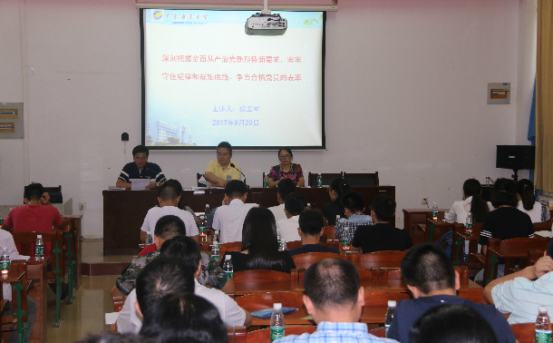 9月20日下午,机械与动力工程学院党委在湖光校区工程训练中心综合楼102室召开2017年纪律教育学习月专题会议暨学院党委中心组学习(扩大)会议。学院党政领导、党委委员、各系中心正副主任、学院全体师生党员参加了会议,会议由学院党委副书记欧卫军主持。