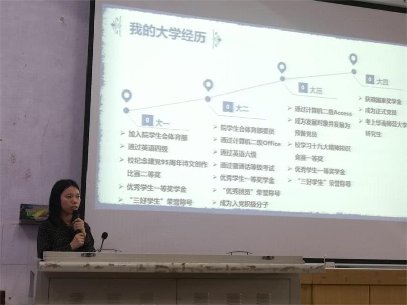 黄月茹、徐颖、韦健、林雨蘅、王国强等同学以自身经历为实例介绍了英语四六级备战、社会实践调研、法律职业资格考试以及公务员考试的心得体会。2019届考取研究生代表姚乐发、颜晓婷、邝思铜、张国正、罗丽仪等同学结合硕士研究生考试讲述了大学学习规划、学习态度、学习与工作协调推进的重要性。在互动提问环节,嘉宾代表们对同学们的疑问一一详细解答。