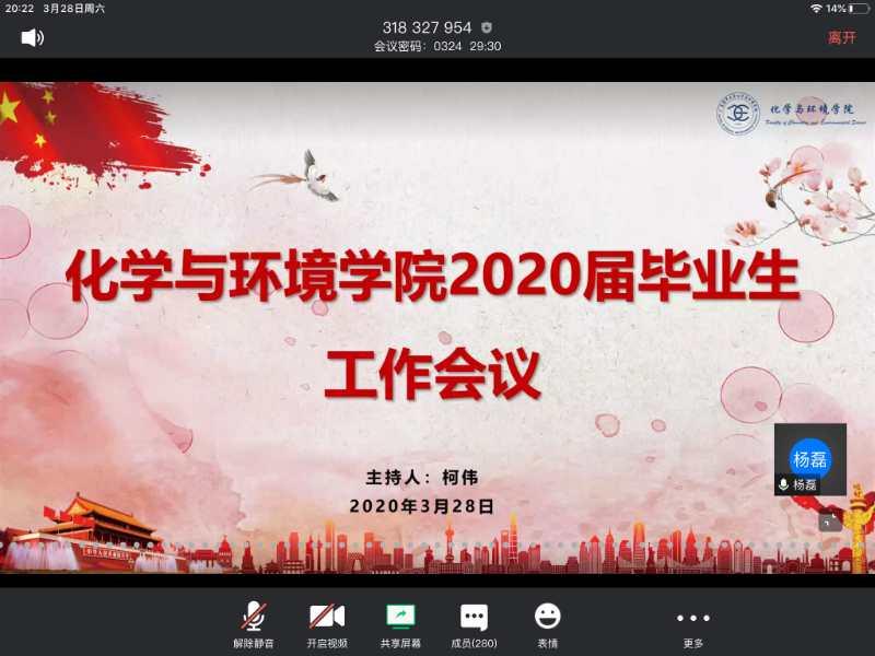 为做好疫情防控期间2020届本科毕业生就业指导工作,3月28日晚上,化学与环境学院通过腾讯会议网络平台召开2020届毕业生工作会议。学院党委书记蔡鹰、院长杨磊、副院长赵辉、系主任、毕业班班主任、辅导员老师和学院2016级学生及家长近300人参加。会议由学院党委副书记柯伟主持。