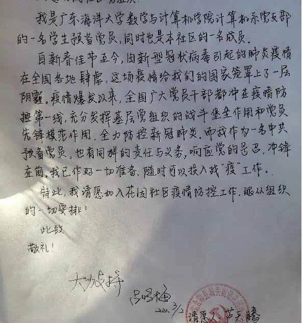 疫情暴发以来,陕西合阳县迅速启动“街社吹哨、部门报到”机制和“在职党员进社区,群防群治战‘疫线’”活动,城市领域171个党组织1436名在职党员和76个党员志愿先锋队到街道社区报到,积极投身到疫情防控阻击战中,让党旗在联防联控一线飘扬,让党徽在群防群治一线闪光。芦天腾同学了解社区服务流程后,立即写了疫情防控请愿书,她写道:“我已做好一切准备,随时可以投入战疫工作。”这是一位当代大学生担当起社会责任的铮铮誓言,践行初心和使命的冲锋号。她在妈妈的带领下,来到了花园社区。当社区工作人员看到请愿书后,备受感动。将她纳入社区志愿者,成为青年突击队一员,分在尚品名居临时党支部,加入红色志愿队伍。