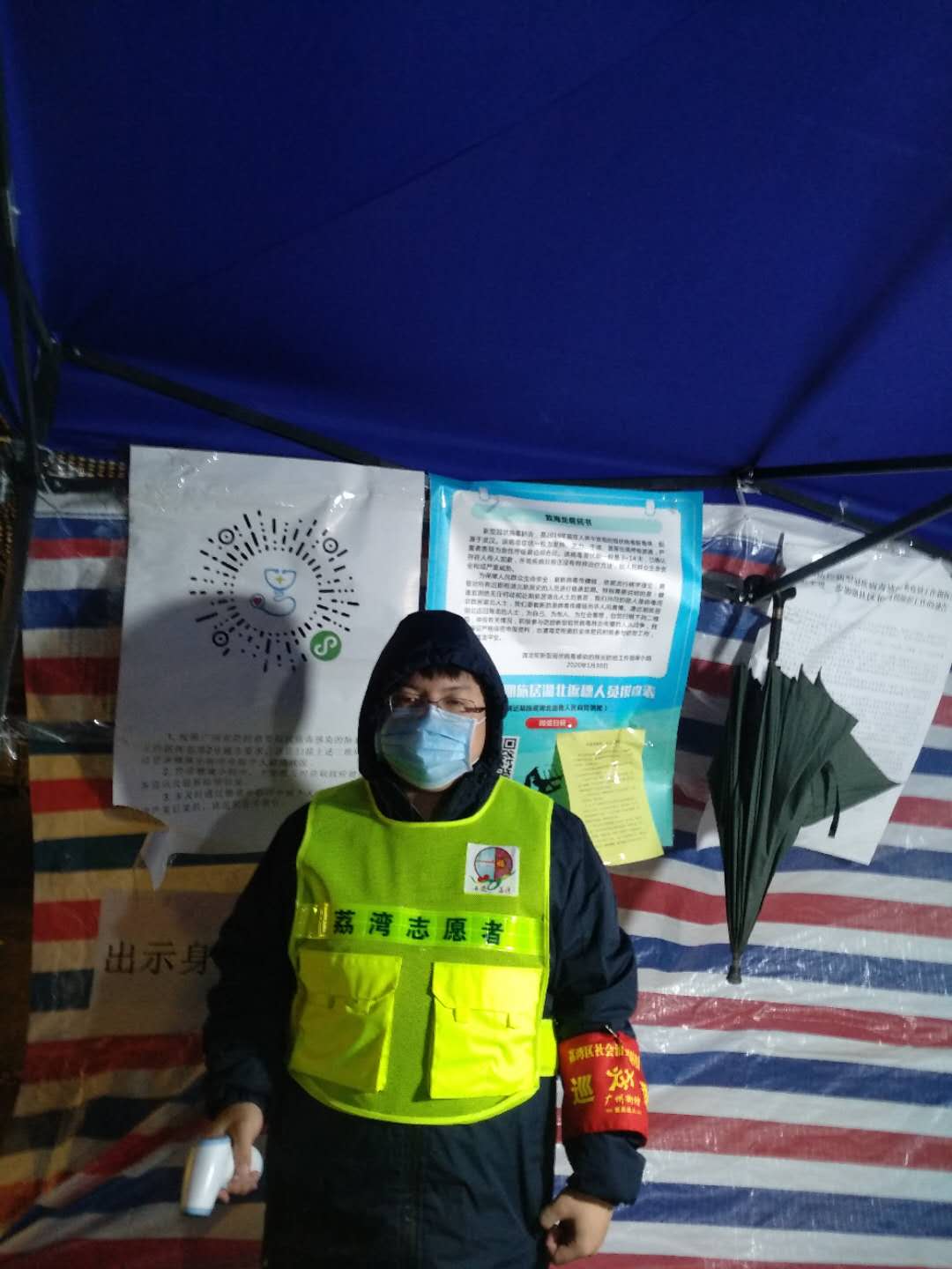 中华儿女有一种信念叫做“战必胜”;有一种亲情叫做“一方有难,八方支援”。生物1181林仲贤同学挺身而出,参加了广州荔湾区海龙街道组织的志愿服务,主要工作是街道设岗检查进入街道人员的体温以及信息。