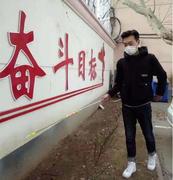 山东省临沂市,国标1171班的学生党员鲍广宣从1月25日开始,坚持每天穿戴上专业消毒弥雾器,对兰山区兰山街道办事处疫情指挥部处所进行全方位消毒,确保消毒无死角、防疫不漏地。