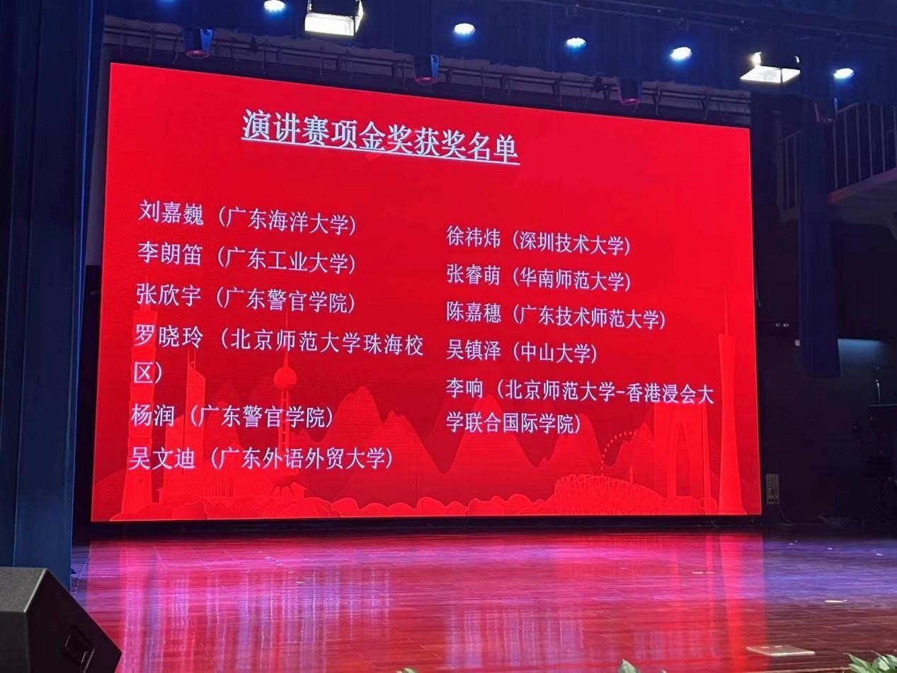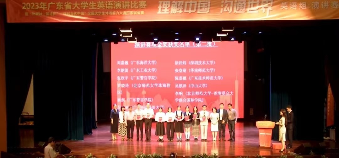2023年广东省大学生英语演讲比赛暨“外研社·国才杯”“理解当代中国”全国大学生外语能力大赛广东省省赛于11月4-5日在北京师范大学-香港浸会大学联合国际学院举行。开云官网外国语学院英语卓越1211班刘嘉巍同学和英语卓越1222班王子祺同学凭借扎实的英语基本功和优秀的语言组织表达能力从155名复赛选手中脱颖而出,双双挺进决赛,最终分获金奖和银奖,其中获得金奖的刘嘉巍同学将代表广东赛区参加12月在北京举办的全国决赛,标志着开云官网学生在此项赛事中取得了新突破。