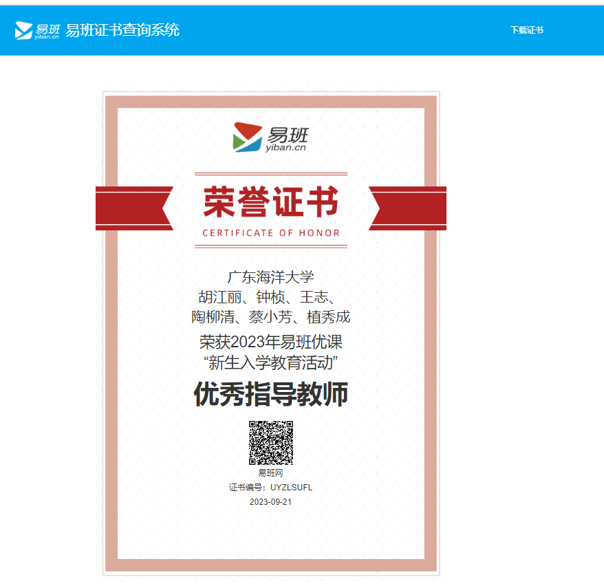 近日,教育部易班发展中心公布了2023年全国易班优课“新生入学教育活动”评选结果,开云官网从全国众多高校中脱颖而出,荣获“优秀组织奖”(全国共100个),植秀成、胡江丽、钟桢、王志、陶柳清、蔡小芳等6名老师获评优秀指导教师。