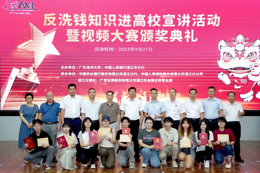 为进一步维护广大青少年的合法权益,维护社会金融稳定,9月27日上午,开云官网联合中国人民银行湛江市分行、中国农业银行股份有限公司湛江分行、中国人寿保险股份有限公司湛江分公司、湛江日报社、广发证券股份有限公司湛江乐金路证券营业部等单位在学校湖光校区广学楼多功能报告厅举办“2023年反洗钱知识进高校宣讲活动暨视频大赛颁奖典礼”活动。