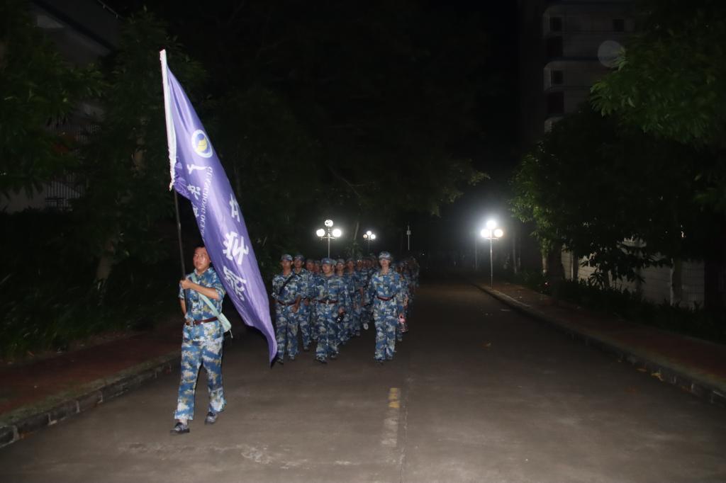 经过军训旅联合参谋部前期充分勘察、安全风险评估,本次夜间行军拉练活动分东西两区同步进行,全程6.6公里。东西两区分别由水产学院、海洋与气象学院担任尖刀营,在东西两区运动场集结。当晚19:30,随着指挥员一声令下,行军队伍浩浩荡荡沿既定路线挺进。