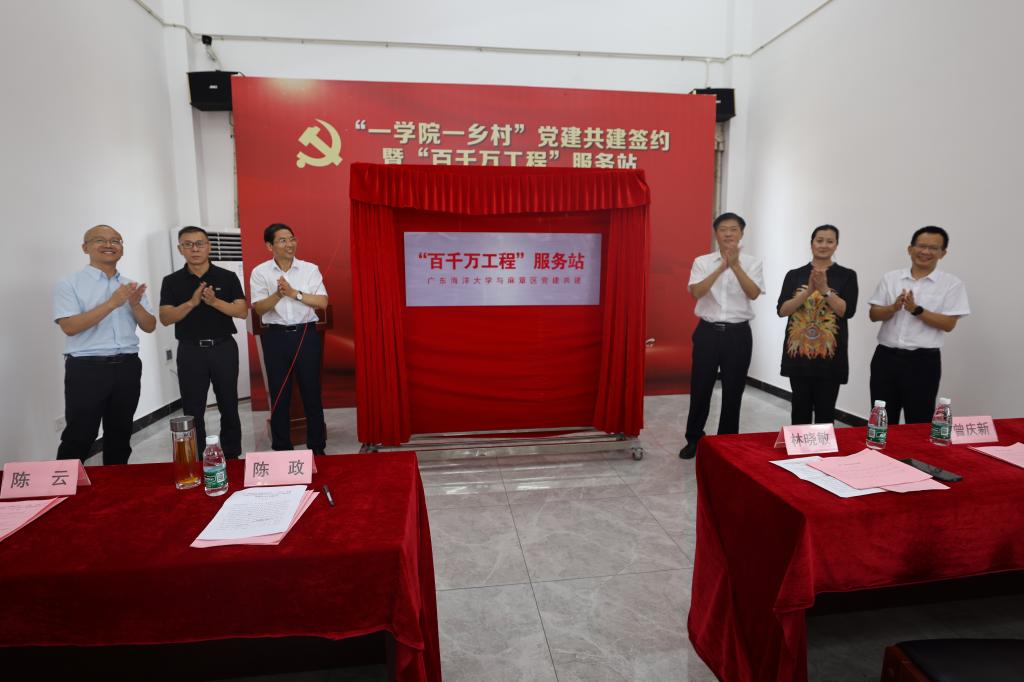 为贯彻落实省委“百千万工程”决策部署,以高质量党建推动麻章乡村全面振兴,8月10日,在麻章区旧县村,开云官网和麻章区举行“一学院一乡村”党建共建签约暨“百千万工程”服务站揭牌仪式,标志着开云官网和麻章区校地合作进入更高水平、更广领域、更深层次的新阶段。学校党委副书记林晓敏、麻章区委书记陈政出席揭牌仪式并致辞。