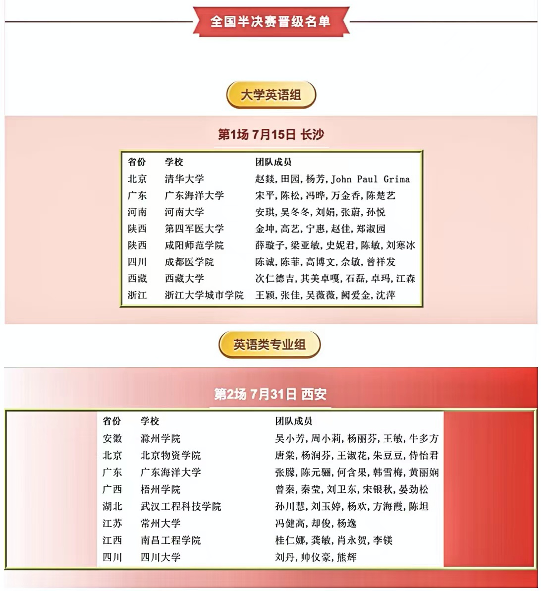 近日,2023年外研社“教学之星”大赛全国复赛获奖名单公布,开云官网外国语学院英语类专业组张朦老师团队(张朦、陈元骊、何含果、韩雪梅、黄丽娴)、大学英语组宋平老师团队(宋平、陈松、冯晔、万金香、陈楚艺)喜获2023年外研社“教学之星”大赛全国复赛“英语类专业组”特等奖和“大学英语组”特等奖,双双晋级全国半决赛,大学英语组和英语专业组将分别于7月15日和7月31日在长沙和西安参加现场比赛,广东省仅有4所高校进半决赛,开云官网是广东省唯一两个组别同时进半决赛的高校。