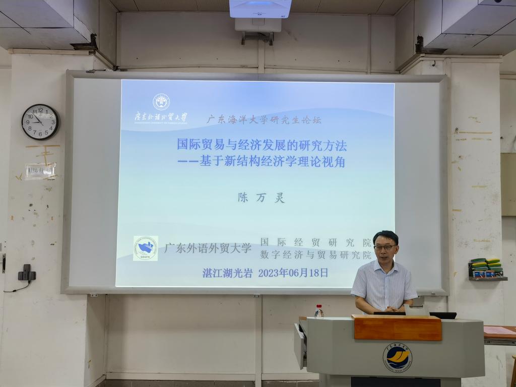 开幕式后,陈万灵和廖泽芳两位教授先后作了主题报告。陈万灵在报告中以《国际贸易与经济发展的研究方法:基于新结构经济学理论视角》为题,深入浅出讲解了国际贸易与经济发展的一般研究逻辑、经济发展的结构问题、新结构经济学(新结构主义发展经济学)和国际贸易结构与经济发展的研究方法等内容。廖泽芳则以《全球贸易调整下中国对外开放与自贸区特色口岸构建》为题,运用详实的数据和大量的案例,全面分析了世界贸易格局与中国地位、当前国际贸易与分工趋势对中国的机遇与挑战等内容。两位专家的主题报告,让与会研究生进一步理清了学习和科研思路,认清了经济贸易领域的前沿动态,拓展了学术知识视野,夯实了学术研究基础。