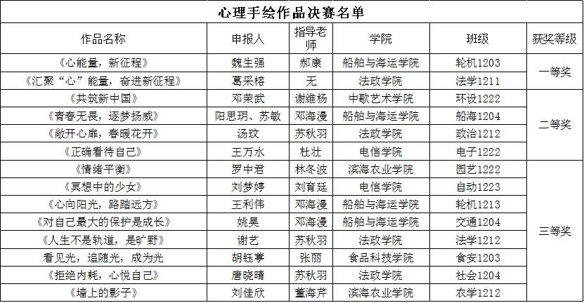 本次活动以“妙笔绘初心”为主题,以心理漫画或心理绘画为表现形式,面向全校学生征集作品。活动邀请了海洋工程与能源学院和船舶与海运学院六位老师担任评委,对作品进行评选。截止5月22日,承办方共收到183幅心理手绘作品。经过初赛与决赛,选出一等奖2名,二等奖4名,三等奖8名,共14幅获奖作品。