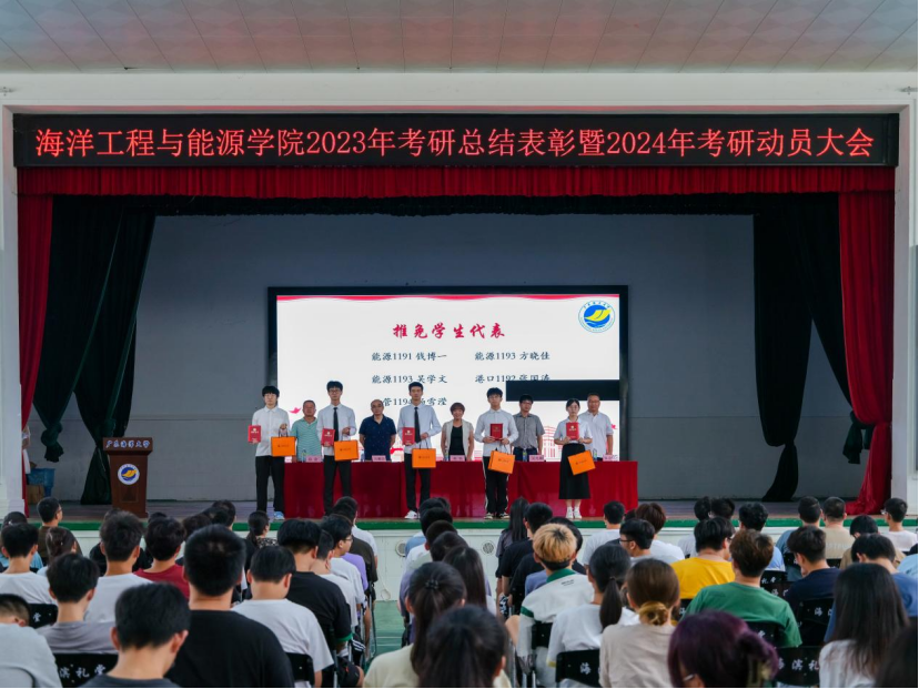 为表彰先进,树立典型,号召全院学生以考研同学为榜样,营造良好的学习氛围,6月7日下午,海洋工程与能源学院在海滨校区小礼堂召开2023年考研表彰暨2024年考研动员大会。学院党委书记邓伟、党委副书记尹霞、副院长吴光林、热能与动力工程系主任冯耀勋、港口航道与海岸工程系主任张会领、工程管理系主任边金、全体辅导员、班主任代表及2019、2020、2021级学生代表总计300余人参加会议。会议由尹霞主持。
