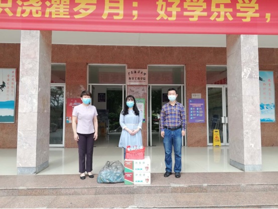 4月30日上午,海洋工程学院庞翠娟老师向学院捐赠850个医用口罩和两箱消毒液,用于支持学院疫情防控工作。海洋工程学院党总支书记邓伟、院长严谨共同接收此次物资捐助。