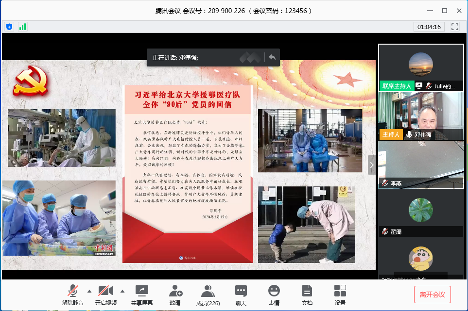 近日,滨海农业学院新学期“思政第一课”在腾讯会议平台“云端”开讲,“思政第一课”由学院党委书记邓伟强,院长陈进军分别主讲。学院党委副书记陈嘉文、学生党支部书记、全体研究生、全体学生党员、发展对象、入党积极分子共455人次参加会议。会议由组织员祝敏丹主持。