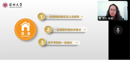 深圳大学经济学院金融系副主任、副教授陈莹博士介绍了自己《金融学》国家级一流课程建设与申报的经验体会,解读了教育部一流课程建设相关文件精神,分析了一流课程五种类型的不同特点、不同评审标准,尤其是一流课程建设的基本原则,国家级一流课程建设、认定趋势、申报的关键点、否决条件等建设和申报技巧。随后,陈莹围绕申报一流课程的基本要求与难点给老师们提出了一些具体建议,并就一流课程申报对申报人与主讲人的相关要求、如何体现课程思政元素和凝练课程特色和亮点、如何克服在一流课程建设过程中学生的负面情绪、如何录制视频课以及如何兼顾师生互动环节和有限课时之间矛盾等老师所提问题给老师们进行了耐心而细致的解答。