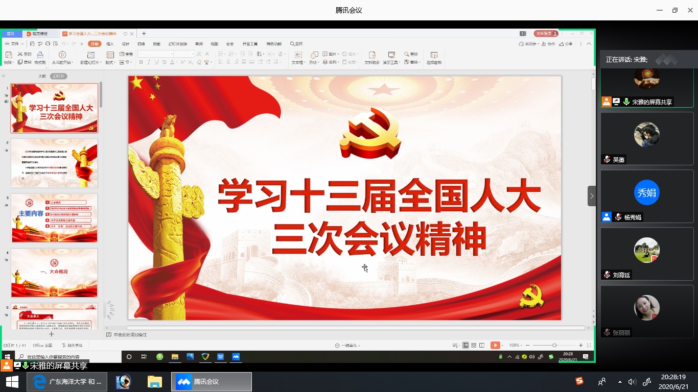 宋雅为全体与会人员讲了题为《学习十三届全国人大三次会议精神》的党课。党课从大会概况、习近平总书记在“两会”期间的重要讲话精神、关于政府工作报告的主要内容、关于民法典的主要内容及全国代表大会关于建立健全香港特别行政区维护国家安全的法律制度和执行机制的决定的主要内容等五个方面进行了系统的学习讲解。其中,重点学习传达了习近平总书记在两会期间参加内蒙古代表团、全国政协经济界委员联组会、湖北代表团、解放军和武警代表团审议时发表的重要讲话精神。在学习政府工作报告时,依照回顾2019年和今年以来的工作、今年发展主要目标和下一阶段工作总体部署、对今后一年的主要工作任务的安排思路进行了梳理和学习。