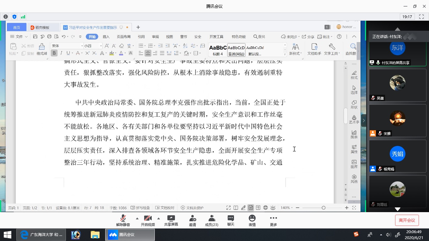 6月21日晚,电信学院党委通过腾讯会议平台召开了理论学习中心组(扩大)会议,学习贯彻习近平总书记关于安全生产重要讲话精神和两会精神。学院党委委员、党支部书记、副科以上干部、辅导员和组织员近30人参加了本次会议,会议由党委书记宋雅主持。
