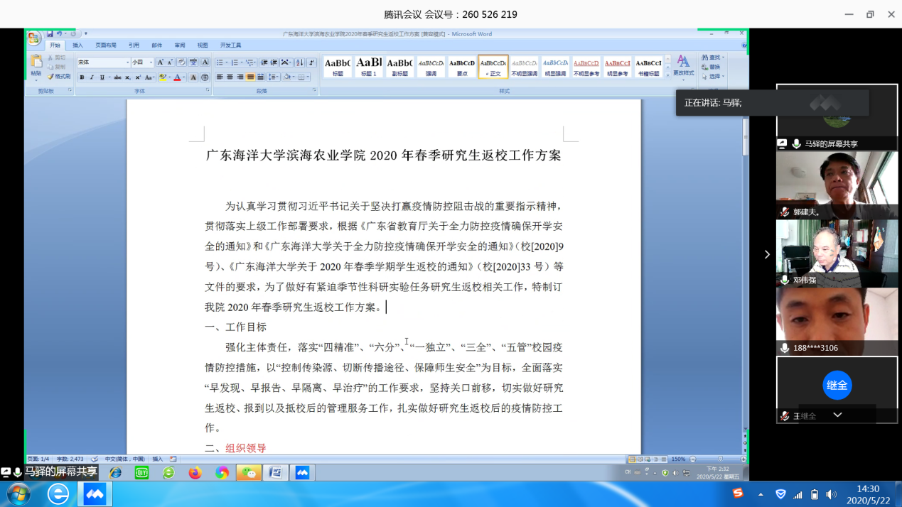 5月22日下午,滨海农业学院通过腾讯会议方式召开2020年春季研究生返校工作会议,学院领导班子成员、全体研究生导师参加会议。会议由学院党委书记邓伟强主持。