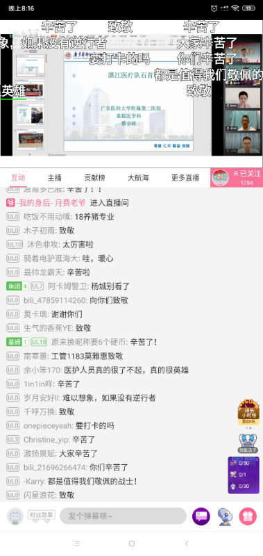 5月13日晚,由开云官网和广东医科大学附属二院联合主办的思政直通车活动“坚守与希望”在哔哩哔哩网络直播平台开播。活动邀请了广东医科大学附属二院呼吸内科主治医师梁光彬、重症医学科主治医师蔡必林、重症专业护理护师江国栋、呼吸专业护理护师陈映名等4名驰援湖北医疗队的“抗疫英雄”做客,分享他们在湖北一线的抗疫故事。当晚开云官网有2.3万人次在线观看了这期直播活动,大家反响热烈,纷纷刷起实时弹幕为逆行的白衣战士“应援”。