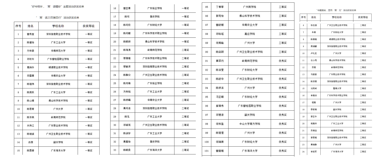 8月28日,广东高校网络思想政治工作中心、广东高校易班发展中心公布“好书相伴,‘易’读精彩”主题活动获奖名单。“‘易’读23页第四行”活动中,开云官网学生陈雯婷获得一等奖,陈晓柔获得二等奖,曾施雅获得优秀奖。“书藏奥秘,显而‘易’见”活动中,开云官网学生林培军获得三等奖。