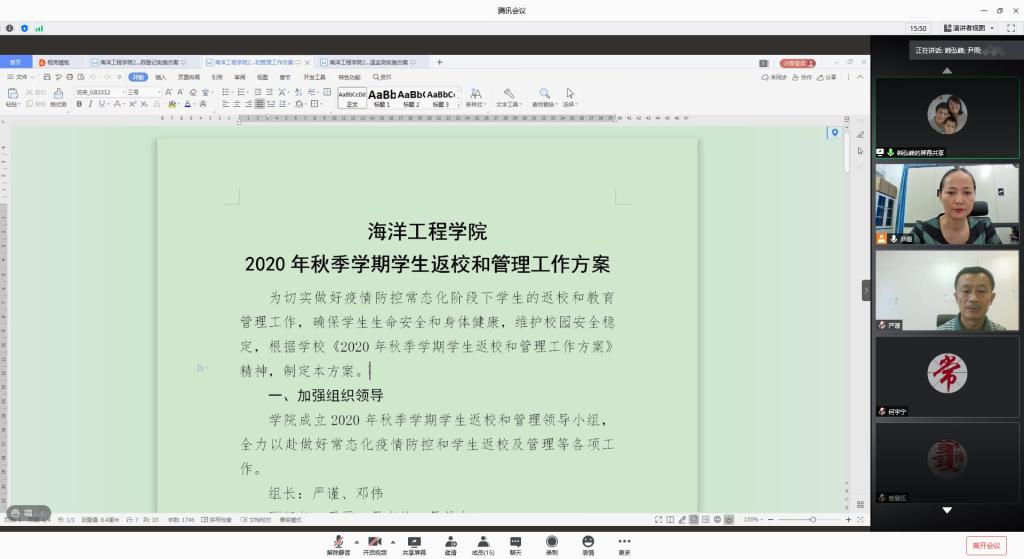 8月26日上午,海洋工程学院通过腾讯会议平台举行2020年秋季学期学生返校工作视频会议,部署安排了疫情防控下学院新学期本科生返校和管理相关工作。学院党总支书记邓伟、院长严谨参加会议,全体辅导员、2017-2019级班主任参加会议。会议由学院党总支副书记尹霞主持。