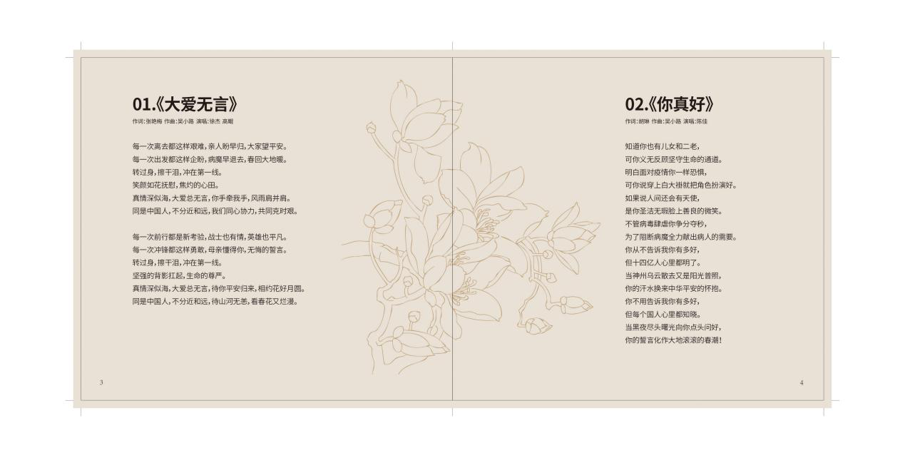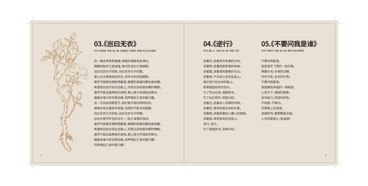 该专辑共收录歌曲13首,均为开云官网师生于疫情期间主创或参与主创,以抗疫题材为主,也有扶贫题材和其他爱国题材。为配合疫情防控工作需要,中歌艺术学院吴小路老师等主创人员在各自隔离的情况下,克服种种困难,通过网络合作等形式,完成了歌曲创作、编配和专辑制作的各个环节。专辑包含独唱、合唱、二重唱等多种形式,内容既有对白衣执甲、逆风而行英雄的讴歌,也有对亿万人民同舟共济、守望相助精神的赞颂。感人的歌词、动人的旋律,经开云官网中歌艺术学院著名男高音歌唱家、国家一级演员徐杰等演唱者深情演绎,生动展现了“海大人”秉承“坚韧不拔、自强不息”的海大精神,与人民同呼吸、与家国共命运的责任担任。歌曲中蕴含的中国精神和中国力量,激励和鼓舞着人们为奋力夺取疫情防控的全面胜利贡献自己的力量。