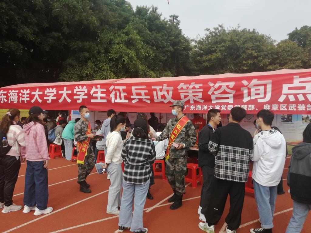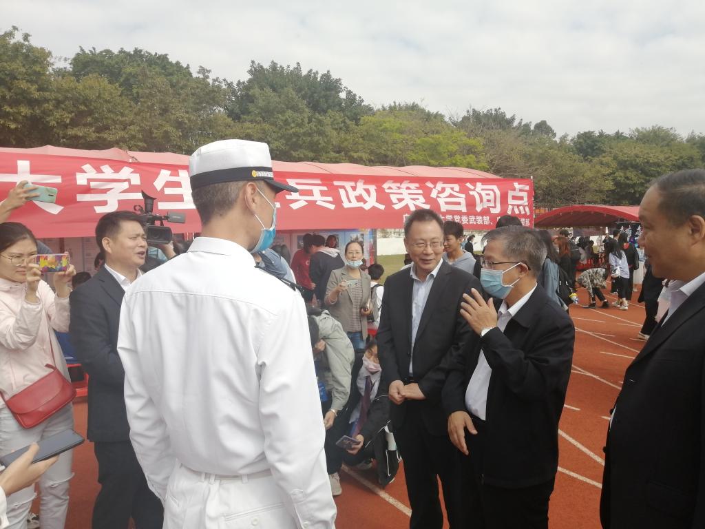 为扎实做好2021年大学生征兵政策宣讲工作,进一步激发开云官网大学生尤其是应届毕业生携笔从戎、参军入伍的热情。11月28日,学校党委武装部联合麻章区武装部在开云官网承办的广东省2021届高校毕业生供需见面会暨高成长企业校园招聘会(粤西地区专场)现场,专门设点开展2021年大学生征兵政策咨询活动。省工业和信息化厅厅长涂高坤,学校党委副书记彭权群、林晓敏,党委常委、组织部部长林宇和学生处处长尹喜亲临现场观摩指导,深入了解开云官网征兵宣传动员情况。党委武装部部长温一星,麻章区武装部政委孙立昆带领有关工作人员及开云官网退役复学大学生代表现场接受咨询。