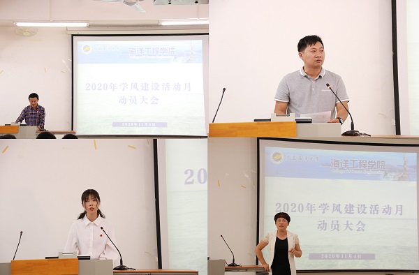 11月4日下午,海洋工程学院在海滨校区电教楼301室,召开2020年“学风建设活动月”动员大会,学院党总支书记邓伟、院长严谨,各系主任、全体辅导员和部分教师代表,学院团委学生会、自律会、易班工作站以及各班级学生代表共计130余人参加会议,党总支副书记尹霞主持会议。
