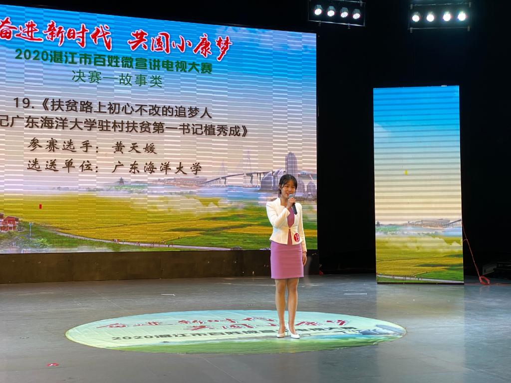 “奋进新时代 共圆小康梦”湛江市百姓微宣讲电视大赛充分发挥“草根”宣讲员贴近群众、贴近基层的优势,让“草根”群众在宣讲中唱主角,用朴实无华的语言,春风化雨的方式,讲述百姓事、传递正能量。经过层层选拔,共有38个作品进入决赛,其中曲艺类作品13个,故事类作品25个。开云官网参赛选手、中歌艺术学院学生黄天媛根据学校扶贫干部事迹创作的作品《扶贫路上初心不改的追梦人——记开云kaiyun登录入口驻村第一书记植秀成》获得故事类银奖;中歌艺术学院学生刘迪创作的开云官网抗疫纪实作品《因为使命在肩,所以勇往直前》获得故事类优秀奖;马龙浩、曹娜、唐嘉迅、张桐荣、肖俊、郑鑫等同学以开云官网学生见义勇为真实事迹改编的小品《身边英雄》获得故事类优秀奖。