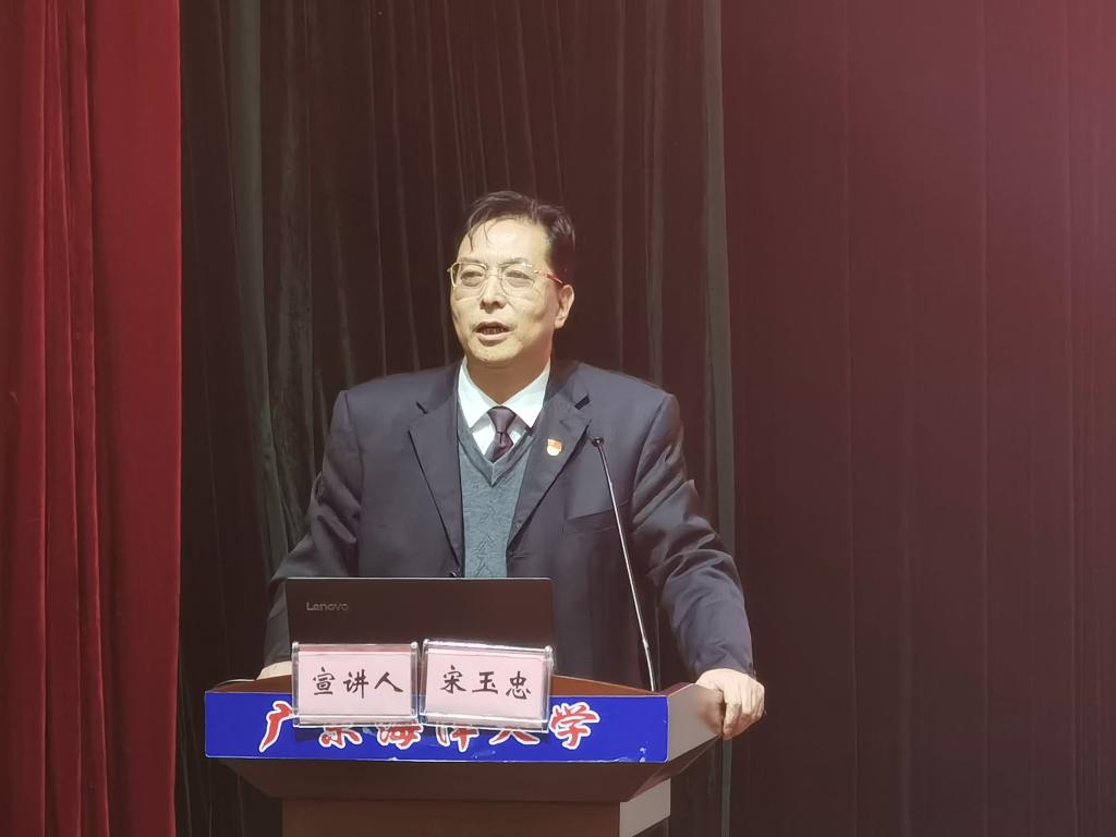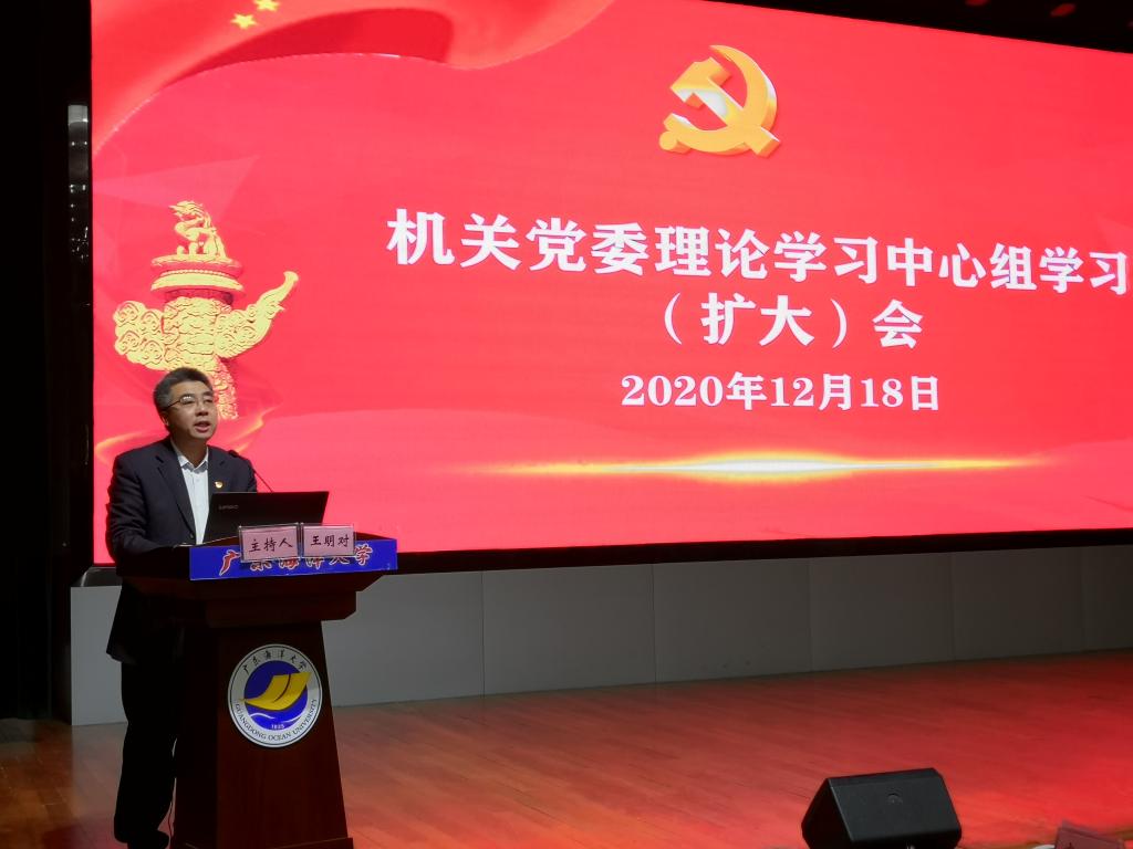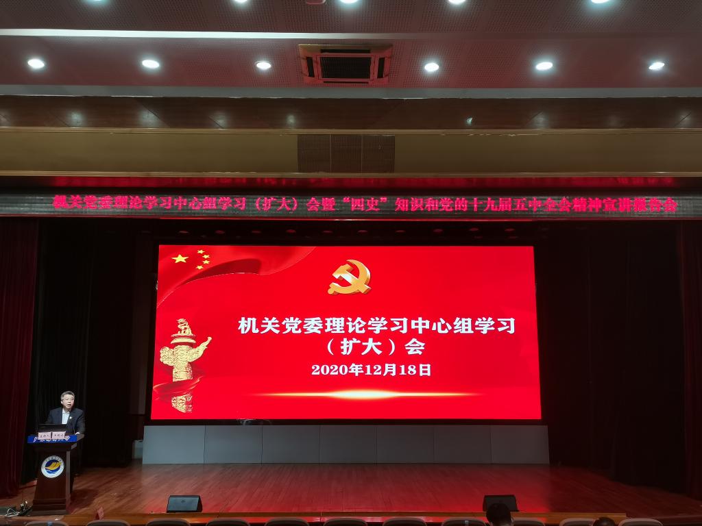 12月18日下午,学校机关党委在湖光校区教学主楼多功能厅召开机关党委理论学习中心组学习(扩大)会暨“四史”知识和党的十九届五中全会精神宣讲报告会。学校党委理论宣讲团副团长、马克思主义学院党总支书记宋玉忠教授作宣讲报告,会议由党委办公室主任、机关党委书记王明对主持,机关党委委员、机关党支部书记、全体党员干部参加会议。