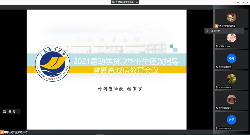 为推动学院2021届国家助学贷款毕业生贷后管理工作顺利开展,增强贷款毕业生诚信意识感恩意识,提高资助育人工作水平,6月10日晚上,外国语学院通过腾讯会议平台召开了2021届助学贷款毕业生还款指导暨感恩诚信教育会议,学院全体贷款毕业生参会,会议由外国语学院辅导员杨岁岁主持。