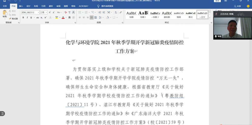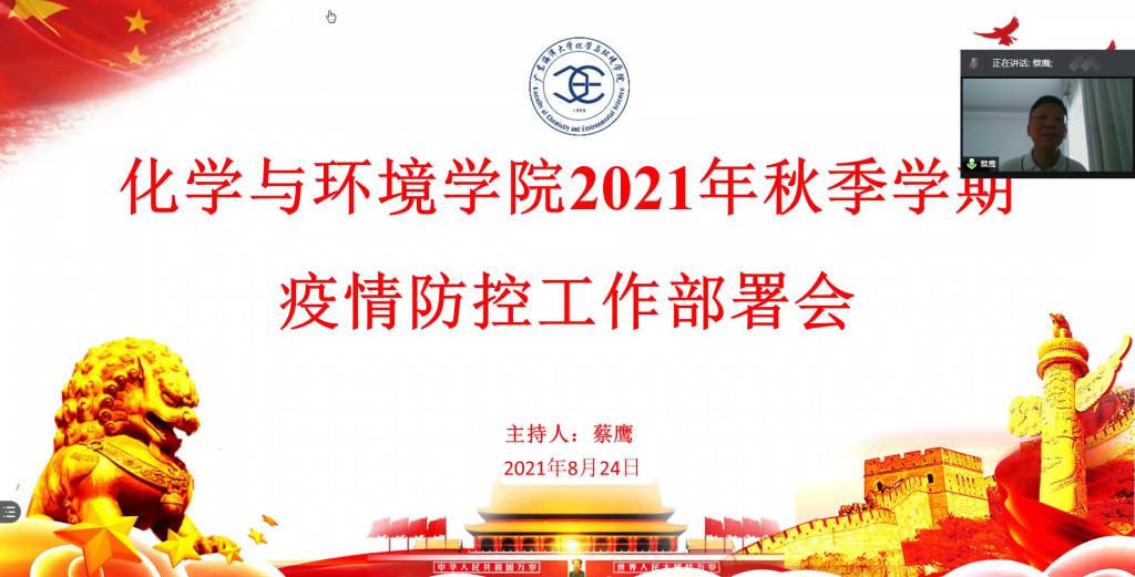 为进一步落实学校和上级关于2021年秋季学期开学疫情防控工作有关通知和会议精神,8月24日上午,化学与环境学院通过腾讯会议召开全体教职工会议,安排部署2021年秋季学期疫情防控工作及开学教学工作。会议由学院党委书记蔡鹰主持。
