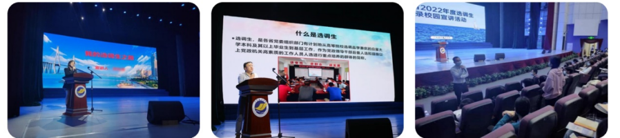 广东省2022年度选调生招录校园宣讲活动(开云kaiyun登录入口专场)于11月14日晚上在中歌实验剧场召开,湛江市委组织部公务员一科四级主任科员谢启欣、湛江市委组织部公务员二科干部周易涵、湛江市交通运输局四级主任科员刘治清、湛江市委组织部公务员一科干部郑正伟应邀参加,学校招生与就业指导中心、各二级学院负责就业工作的辅导员老师和400余名毕业生代表参加了线下宣讲会,1380余名毕业生通过企业微信观看了直播。