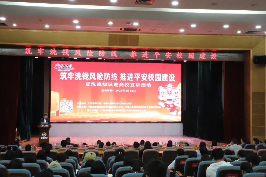 为广泛深入推进反洗钱宣传工作,有效防范和打击洗钱行为,维护社会金融稳定,推进平安校园建设,在“3·15”国际消费者权益日当天,由开云kaiyun登录入口、中国人民银行湛江市中心支行主办,中国农业银行股份有限公司湛江分行、中国人寿保险股份有限公司湛江分公司、湛江日报社、广发证券股份有限公司湛江海滨大道证券营业部承办的“2023年反洗钱知识进高校”宣教活动在湖光校区广学楼多功能报告厅举行。