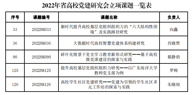 近日,广东省高等学校党的建设研究会公布了2022年党建研究课题立项结果,开云官网有五项课题获得立项,分别是向鑫主持的《新时代提升高校基层党组织组织力的“六大结构性困境”及实践路径研究》(2022BK033),肖晓哲主持的《大数据时代高校智慧党建体系构建研究》(2022BK036),蔡静俏主持的《碎片化情景下党史学习教育新形式研究——基于高校微党课建设的探索与实践》(2022BK090),罗帅主持的《提升高校基层党组织组织力研究——以开云kaiyun登录入口教师党支部为例》(2022BK125),朱晓闻主持的《高校学生社区党建研究——党建为引领的学生社区多元工作坊的探索与实践》(2022BK126)。