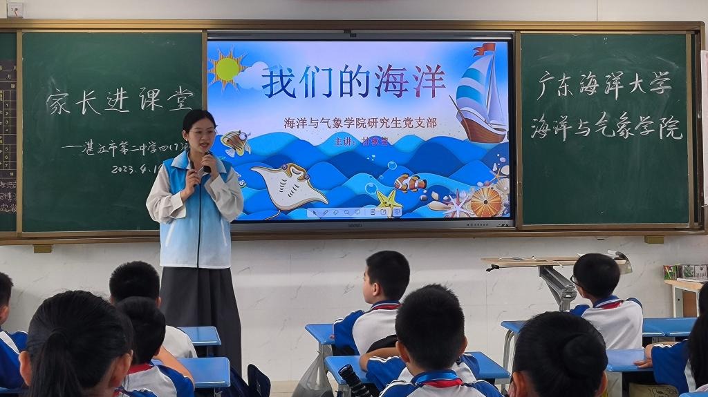 为发展海洋经济,保护海洋生态环境,加快建设海洋强国,4月19日,海洋与气象学院团委开展“探秘气象万千,守护碧海蓝天”科普讲堂活动。学院党委组织员马登值、学院团委书记黄瑞焕带领研究生党支部甘秋莹、团委学生会学生谢梓涵、苏静蕾、王佳楠等赴湛江市第二中学小学部开展海洋大气知识宣讲。