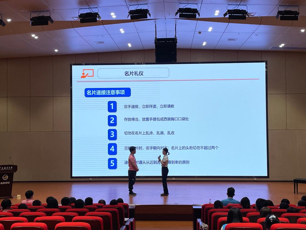 关天宇以“青春心向党 建功新时代”为主题,对习近平总书记在庆祝中国共产主义青年团成立100周年大会上的重要讲话精神和在中国人民大学考察时发表的重要讲话精神进行了解读,带领同学们回顾共青团始终与党同心、与党奋斗的历史,解答新时代中国青年运动及青年工作的方向、习近平总书记对新时代青年和团干部提出的新要求。她指出,青年要努力成长为堪当民族复兴重任的时代新人,要继续发扬优良传统、认真履职尽责,努力奋斗,为中华民族伟大复兴贡献青春力量。黄华荣从什么是礼仪以及为什么要学习礼仪引入课程学习,对礼仪常识的仪表和行为作了解读,围绕介绍、握手、名片、会议座位、宴会餐桌、茶水和乘车等日常生活中常见的礼仪进行详细讲解,并现场示范,与同学们开展互动。两位老师授课生动活泼,学员们认真聆听、受益匪浅。