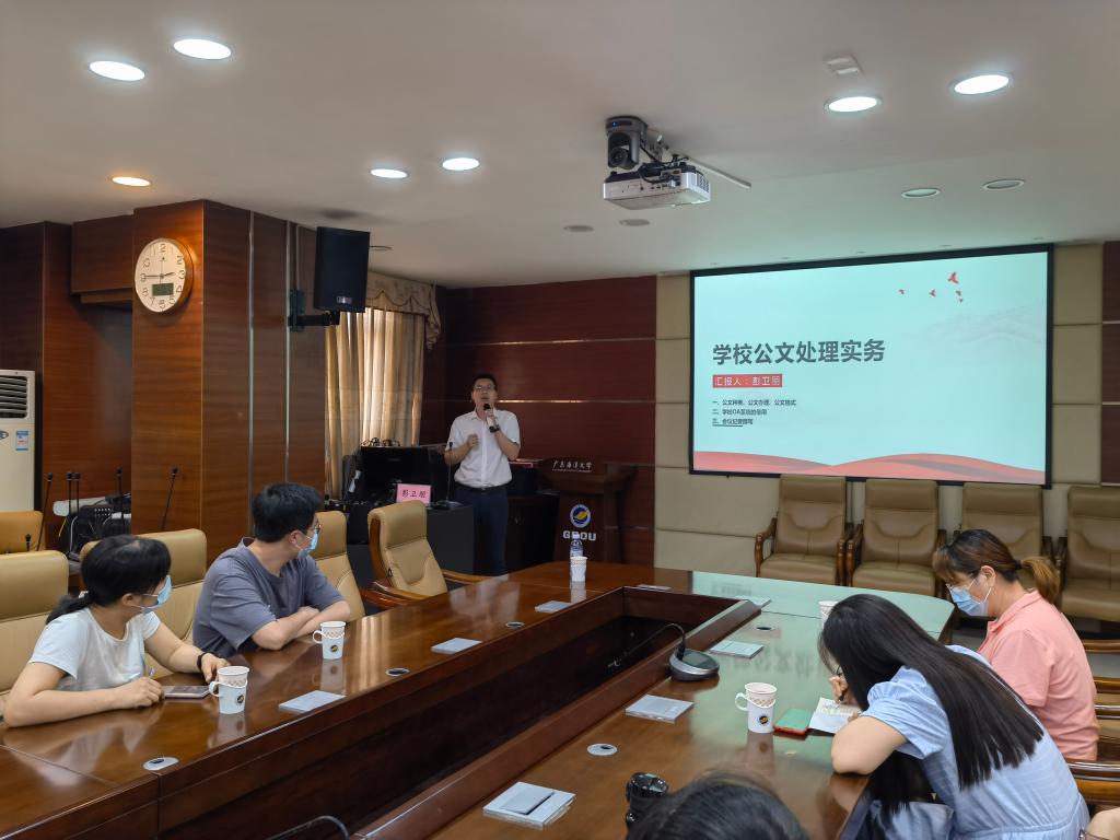 第二场:6月1日,行政工作专题培训在行政楼5楼会议室进行,校长办公室秘书科科长彭卫朋应管理学院、文学与新闻传播党委所邀,作有关公文写作规范、学校OA使用、会议纪要撰写等方面的专题辅导报告。两学院相关干部教师参加了会议。