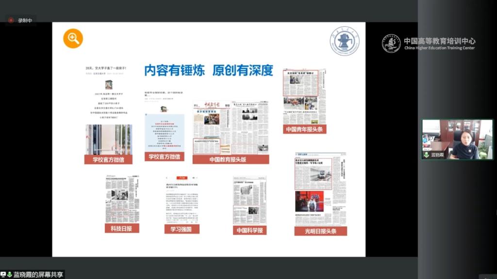 本次研修班由中国高等教育培训中心主办,通过线上授课。中国教育在线总编辑陈志文、北京交通大学党委宣传部部长蓝晓霞、中国传媒大学新闻学院教授詹新惠、新华社微信公众号主编王朝、清华大学新闻与传播学院副院长周庆安等五位专家分别围绕高校新闻宣传与舆情管理、互联网语境下高校信息传播和媒介融合、高校教师舆情热点、融媒体报道的实战技巧、打造校园文化品牌等专题,结合理论阐释和案例分析,对媒体融合发展、信息传播、网络舆情应对、校园文化建设等当前高校宣传思想工作的重点、难点和热点问题进行了深入解析,提出了应对策略。