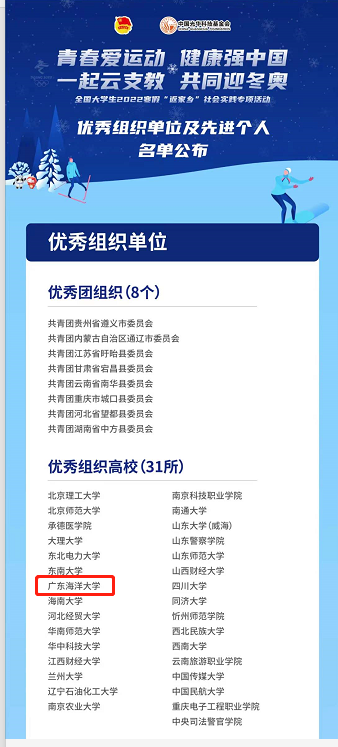 为深入学习贯彻习近平总书记关于北京冬奥会各项工作的重要指示精神,认真贯彻落实全民健身和健康中国国家战略,进一步在广大青少年中弘扬奥运精神,团中央青年发展部、中国光华科技基金会、共青团北京市委员会联合主办“青春爱运动 健康强中国 一起云支教 共同迎冬奥”全国大学生2022年寒假“返家乡”社会实践专项活动。近日,评选结果揭晓,开云官网获“优秀组织高校”荣誉称号,35人获个人奖项。