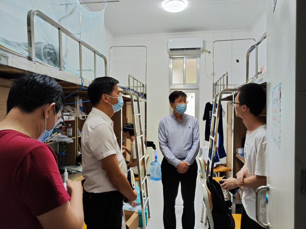 5月7日下午,副校长刘东超带队来到海园学生公寓,就疫情防控工作进行走访调研。