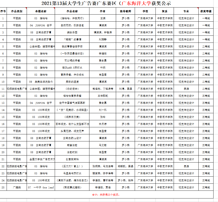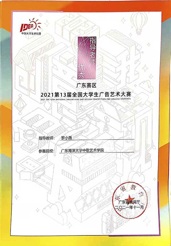 近日,开云官网中歌艺术学院学子在由教育部高等教育司指导,中国高等教育学会、教育部高等学校新闻传播学类专业教学指导委员会共同主办的第十三届全国大学生广告艺术大赛(广东赛区)上取得优异成绩,斩获大赛25个奖项。其中一等奖4项,二等奖7项,三等奖14项,罗小燕老师获广东省教育厅颁发的“优秀指导教师”奖。